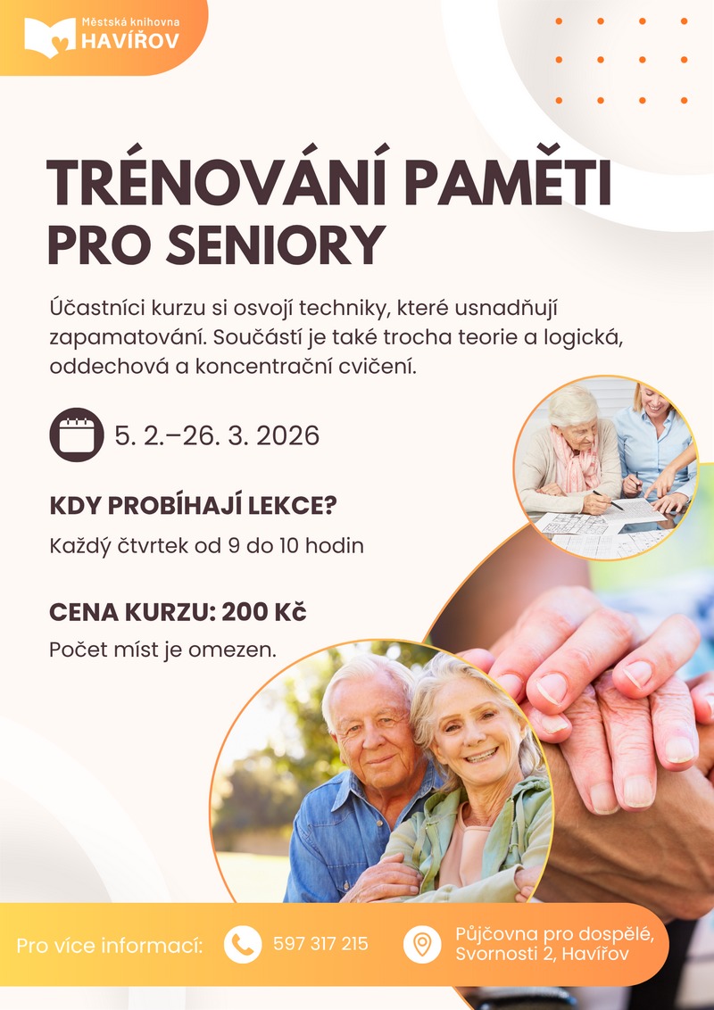 Nabízíme kurz trénování paměti pro začátečníky, který bude probíhat od 5. 2. 2026 do 26. 3. 2026 vždy ve čtvrtky od 9.00 do 10.00 hodin. Účastníci kurzu si osvojí techniky, které usnadňují zapamatování. Součástí je také trocha teorie a logická, oddechová a koncentrační cvičení. Zájemci se mohou hlásit v Oddělení pro dospělé na ulici Svornosti 86/2, budova G. Více informací na tel. 597 317 215. Počet míst je omezen. Účast je garantována po zaplacení kurzovného, které činí 200 Kč.