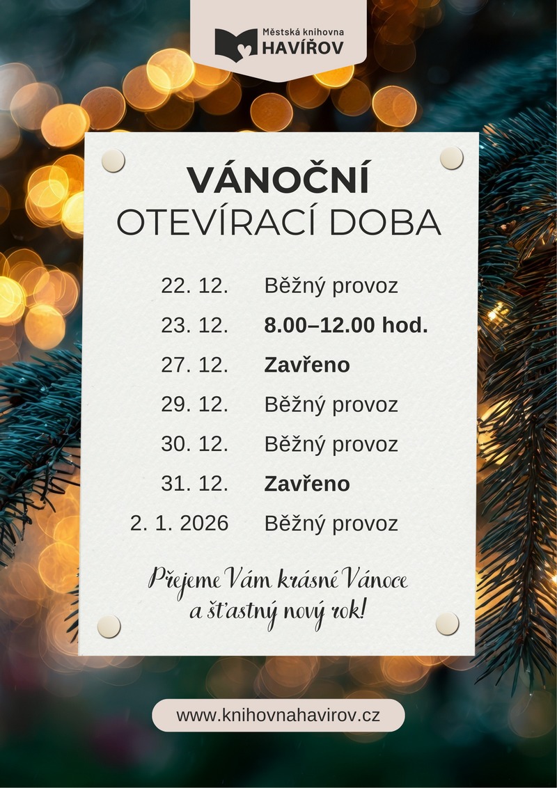 Ve dnech vánočních svátků 24.-26. 12. 2025 a na Nový rok 1. 1. 2026 budou všechny pobočky knihovny uzavřeny.