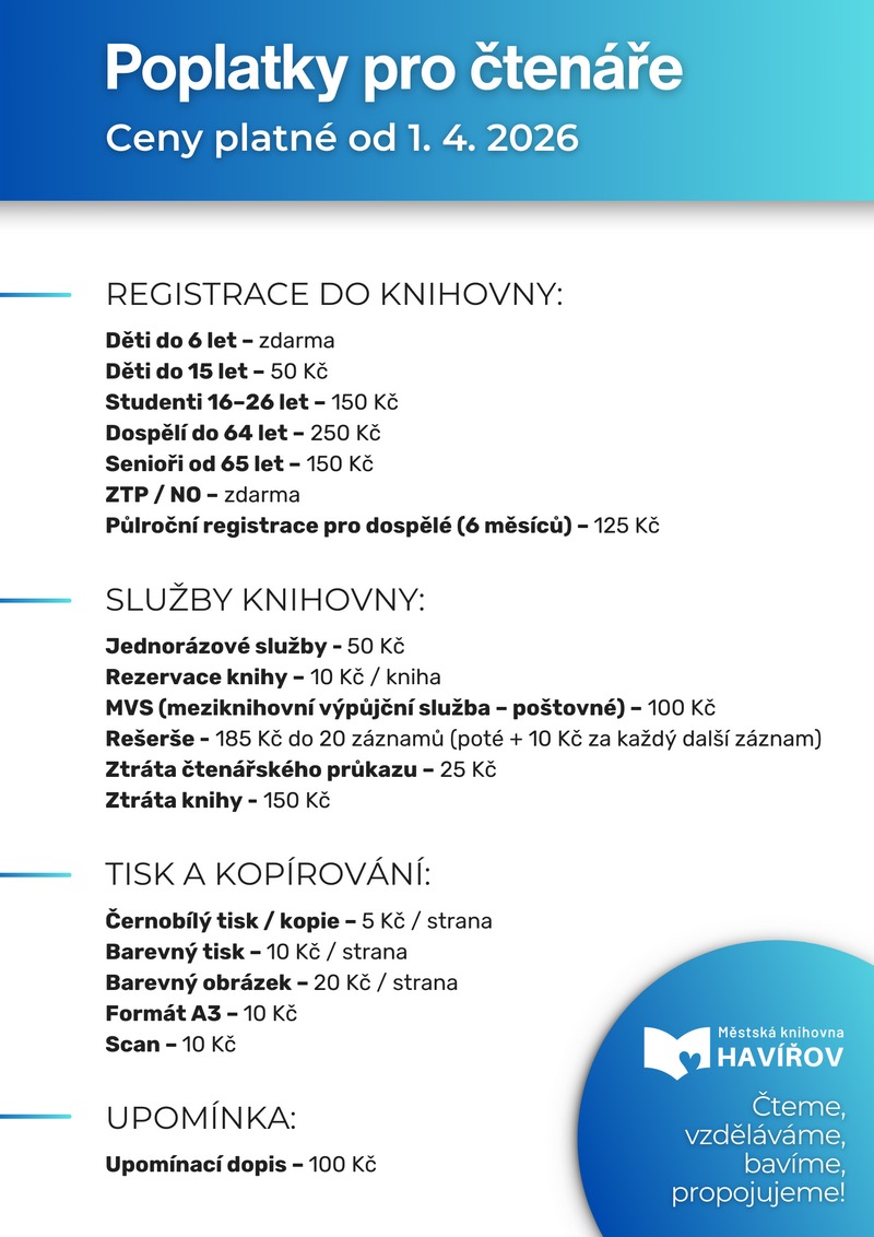 rádi bychom vás informovali, že od 1. 4. 2026 dochází k navýšení poplatků za registrace a služby poskytované Městskou knihovnou Havířov. Děkujeme vám za pochopení.