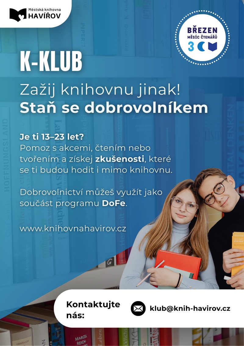 Dobrovolnictví můžeš využít jako součást programu DoFe. Kontakt: klub@knih-havirov.cz